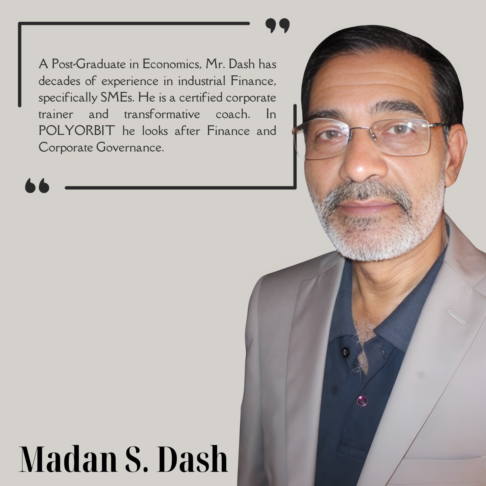 A Post-Graduate in Economics, Mr. Dash has decades of experience in industrial Finance, specifically SMEs. He is a certified corporate trainer and transformative coach. In POLYORBIT he looks after Finance and Corporate Governance.